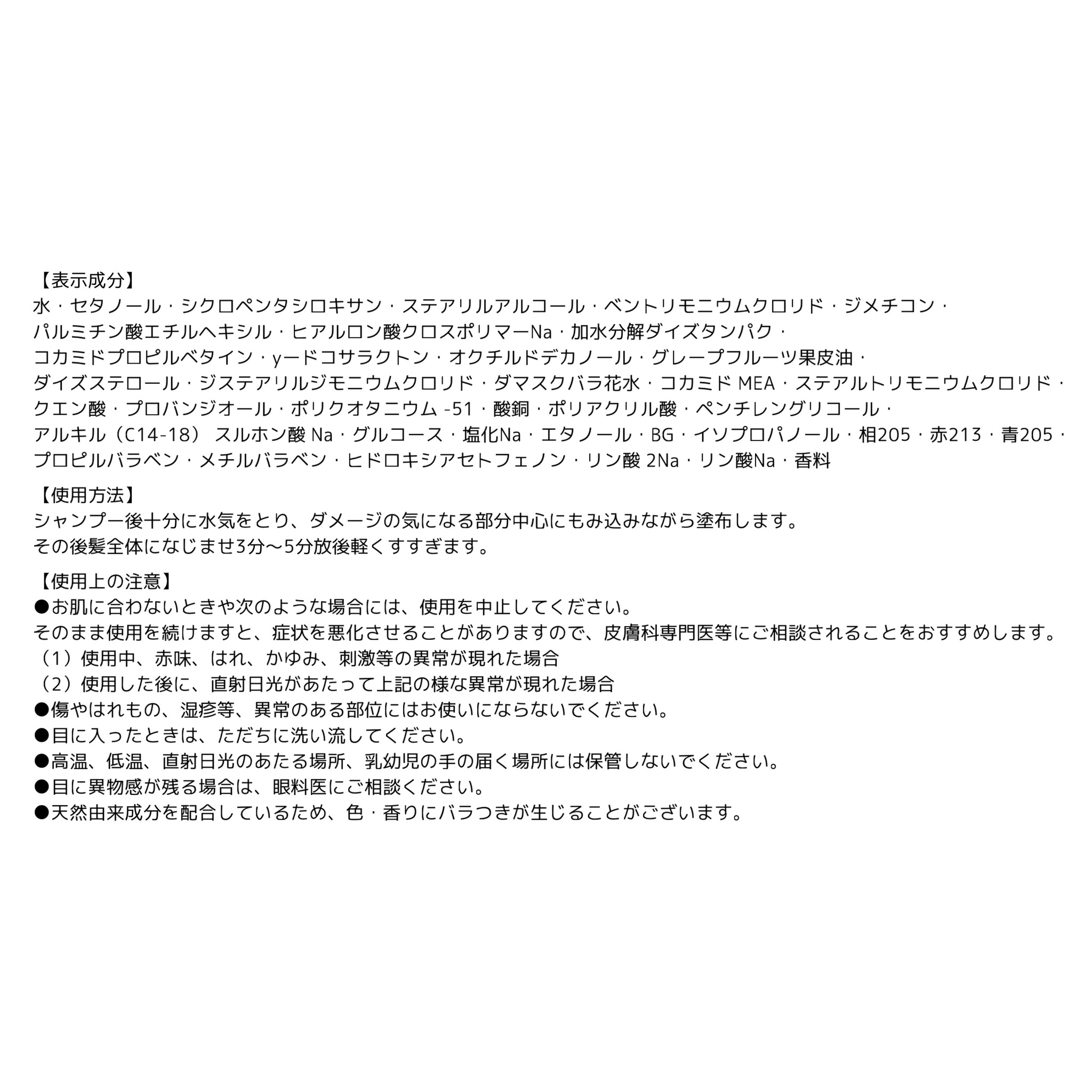 高頻度のサ活をする方、ブリーチ毛や縮毛矯正の方のダメージ部分を高補修成分がくるみ手触りを滑らかにします。